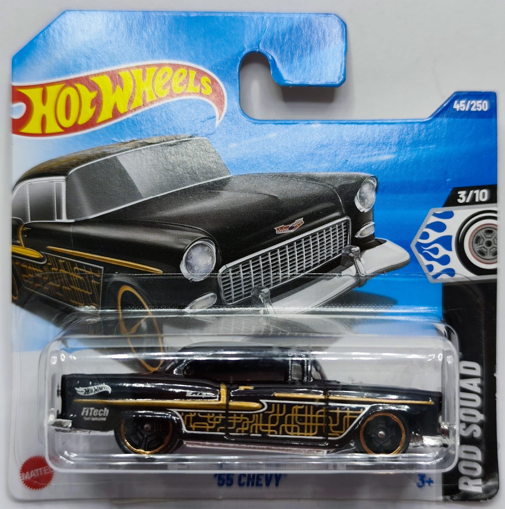 Wariant 2025 Rod Squad (3/10) prezentuje się w eleganckim połyskującym czarnym lakierze, ozdobionym złotymi i srebrnymi pinstripami na bokach i dachu. Na drzwiach znajdują się logotypy “FiTech Fuel Injection”, “Bel Air” oraz klasyczne logo Hot Wheels. Model posiada chromowaną plastikową bazę, czerwone szyby, czarne wnętrze oraz koła CGBMC5, które nadają mu wyrazistego, customowego charakteru.