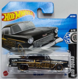 Hot Wheels ’55 Chevy (2006) – 2025 – HYW96 to klasyczny casting autorstwa Larry’ego Wooda, inspirowany legendarnym Chevroletem Bel Air z 1955 roku — jednym z najbardziej rozpoznawalnych samochodów ery hot‑rodów. Model od lat cieszy się ogromną popularnością dzięki muskularnej sylwetce, charakterystycznym płetwom i bogatym detalom.