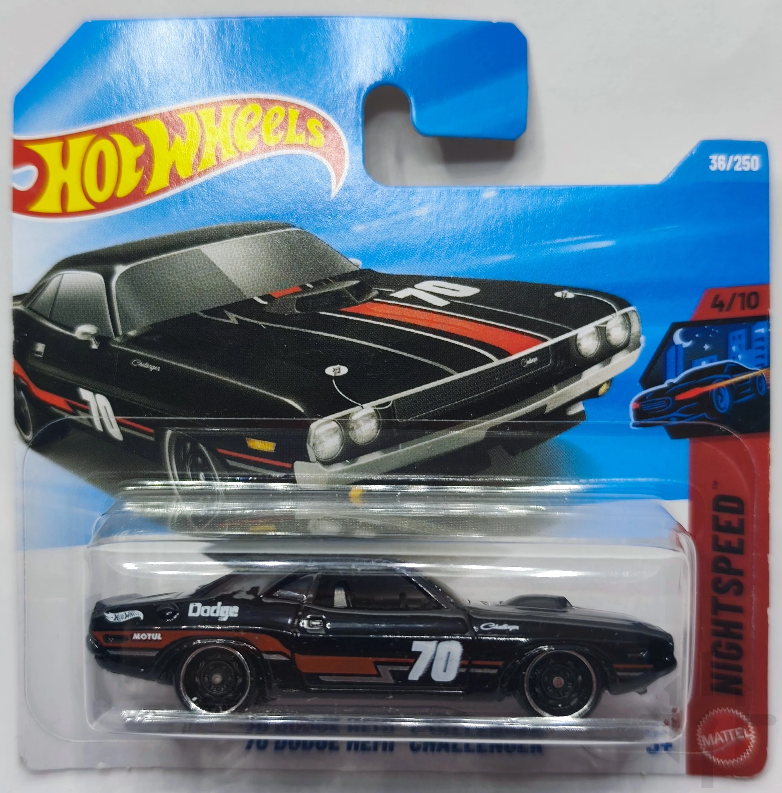 ’70 Dodge Hemi Challenger to klasyczny amerykański muscle car, wyposażony w legendarny silnik 426 HEMI i charakterystyczną „Shaker Hood”. Casting Hot Wheels zadebiutował w 2006 roku i od tego czasu doczekał się wielu wariantów, w tym retoolingu z 2017 roku, w którym grill został odlewany jako część nadwozia. Wersja JJK79 (2026) należy do serii Nightspeed i prezentuje agresywny, nocny styl z wyrazistymi pasami i numerem „70”.