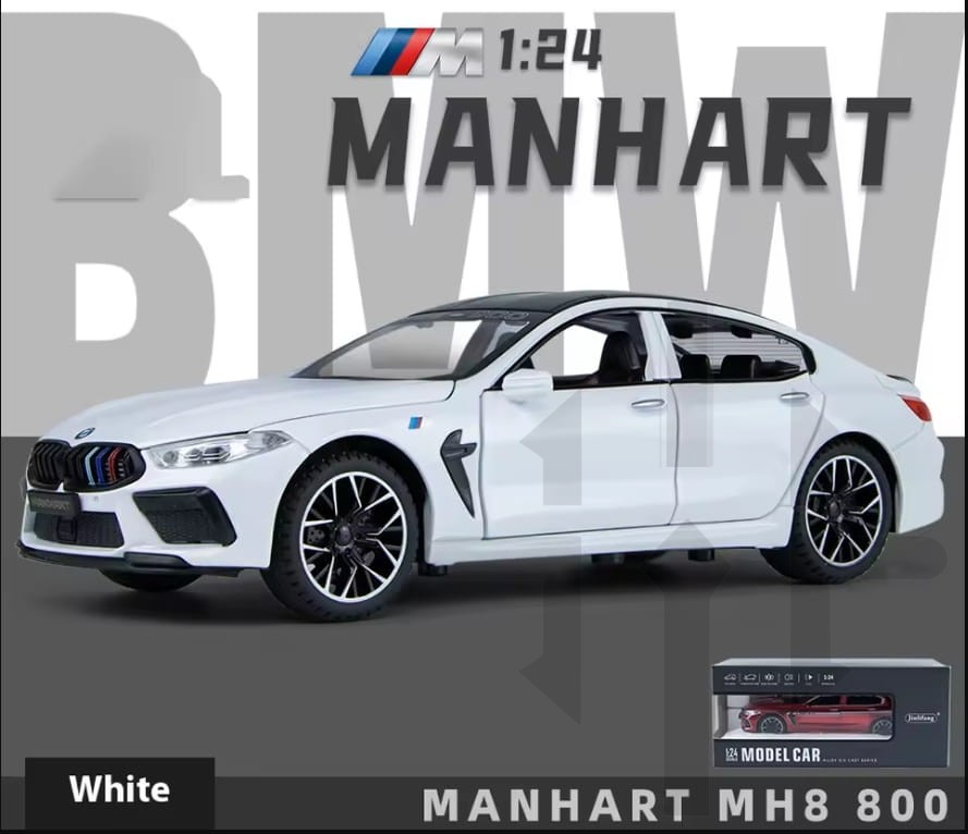 Model JINLIFANG 1:24 MANHART MH8 800 to metalowa miniatura BMW M8 w wersji tuningu Manhart MH8 800, wyposażona w efekty dźwiękowe i świetlne. Jest to dynamiczny model kolekcjonerski, który odwzorowuje jedną z najmocniejszych odmian BMW M8 przygotowaną przez niemieckiego tunera Manhart.