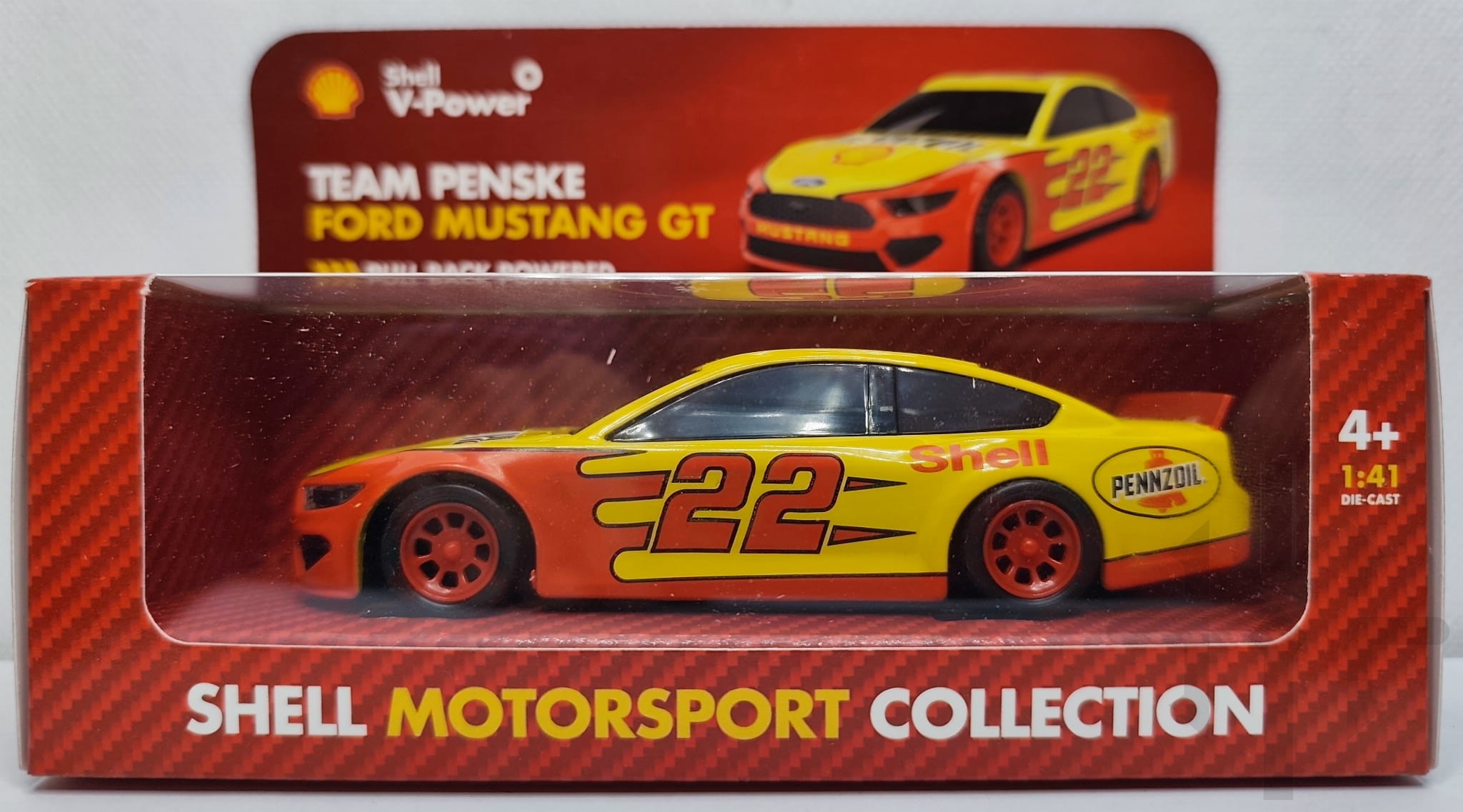 Ford Mustang GT - 1:41 - Shell V-Power (żółty) to limitowany model kolekcjonerski z serii Shell Racing Legends, wydany około 2017–2018 roku. Wyróżnia się nietypową skalą 1:41, z mechanizmem PullBack.