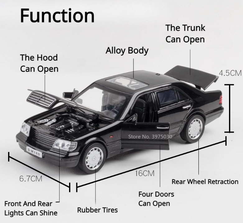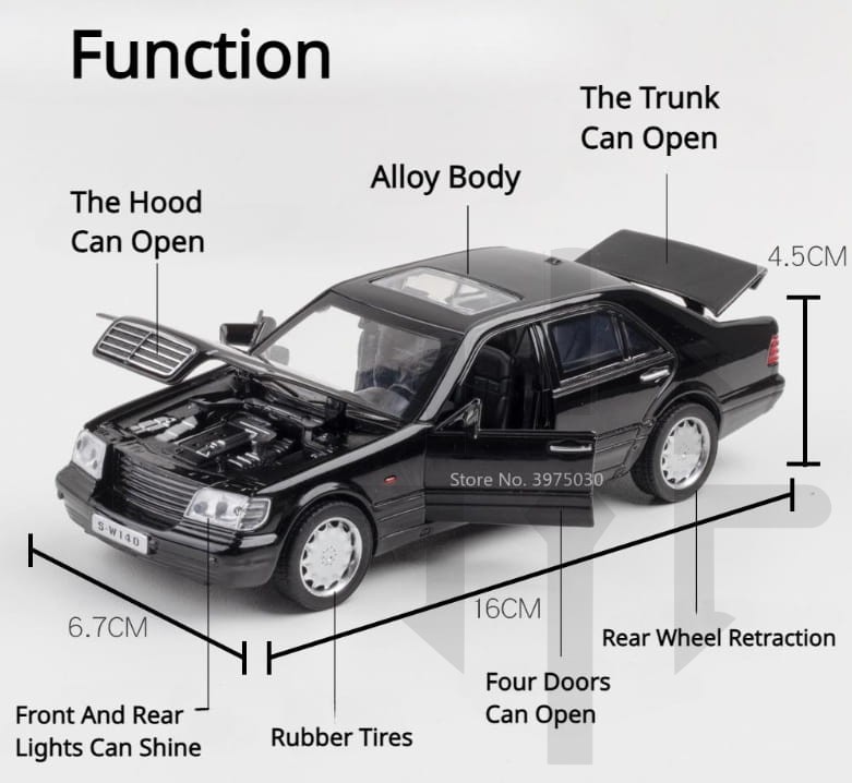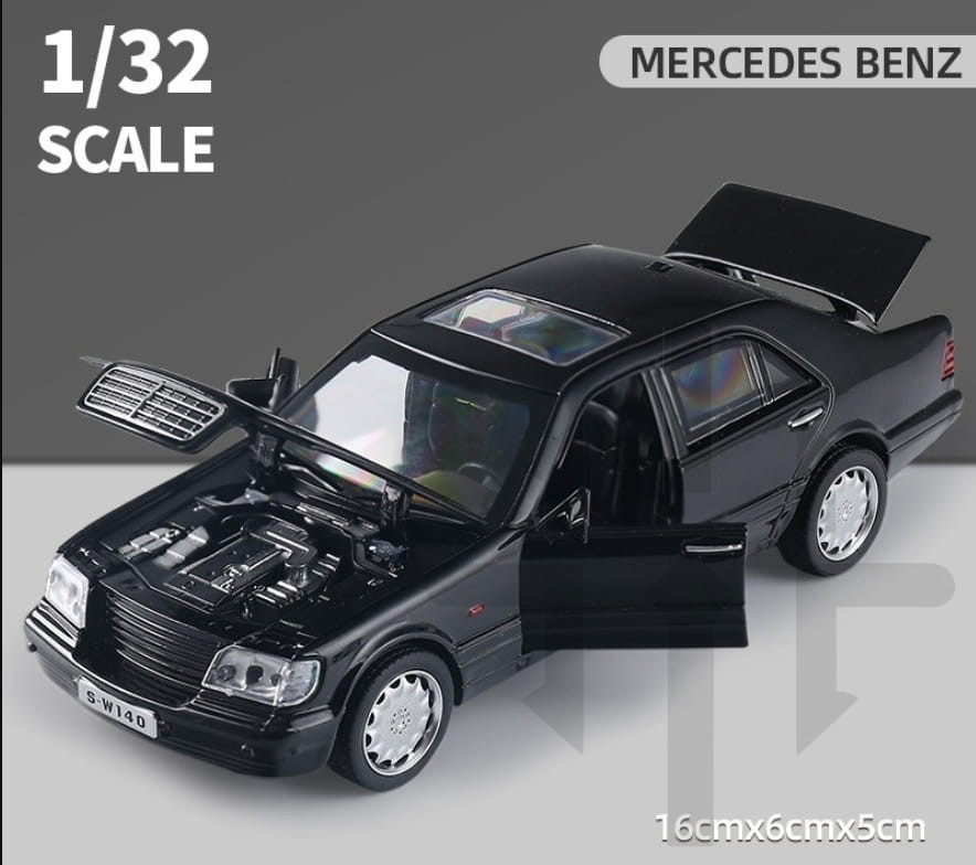 Metalowy model kolekcjonerski w skali 1:32, produkowany przez chińską markę Jianyuan Toys, odwzorowujący luksusową limuzynę Mercedes-Benz W140.