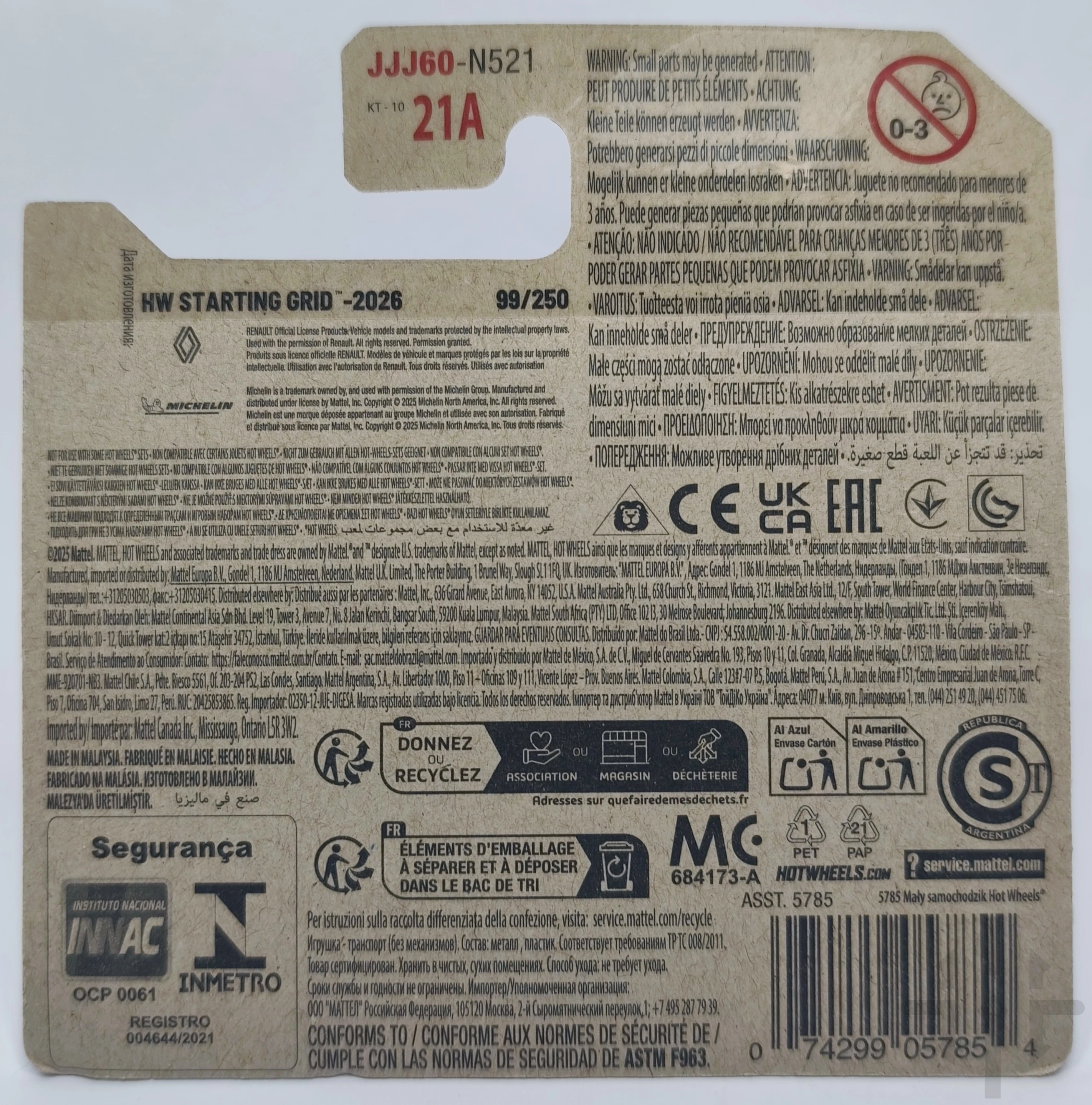 Wersja 2026 HW Starting Grid (6/10) otrzymała niebieskie nadwozie z pełnym wyścigowym malowaniem: Hot Wheels, Team HW, numer 1, logotypy ATN oraz Michelin Man. Podwozie czarne (plastic), szyby smoke tint, wnętrze niebieskie, koła Chrome Orange L4. Produkcja: Malaysia, kody bazowe: U44N / U45N.