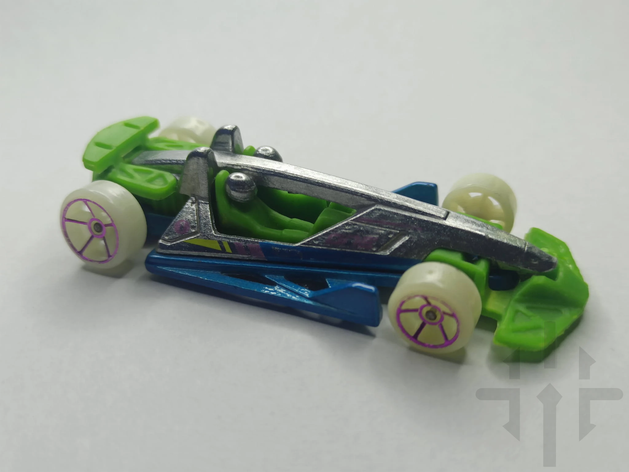 Hot Wheels Track Hammer – wydanie Mystery Models Series 1 (2019). Wariant Silver z żółto‑niebiesko‑różowymi paskami i logo Hot Wheels na bokach. Model z ruchomym splitterem, futurystyczny bolid typu open‑wheel. Koła Glow in the Dark + Black OH5. Oryginał, stan bardzo dobry, kolekcjonerski. Kod modelu: GBD49.