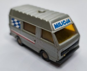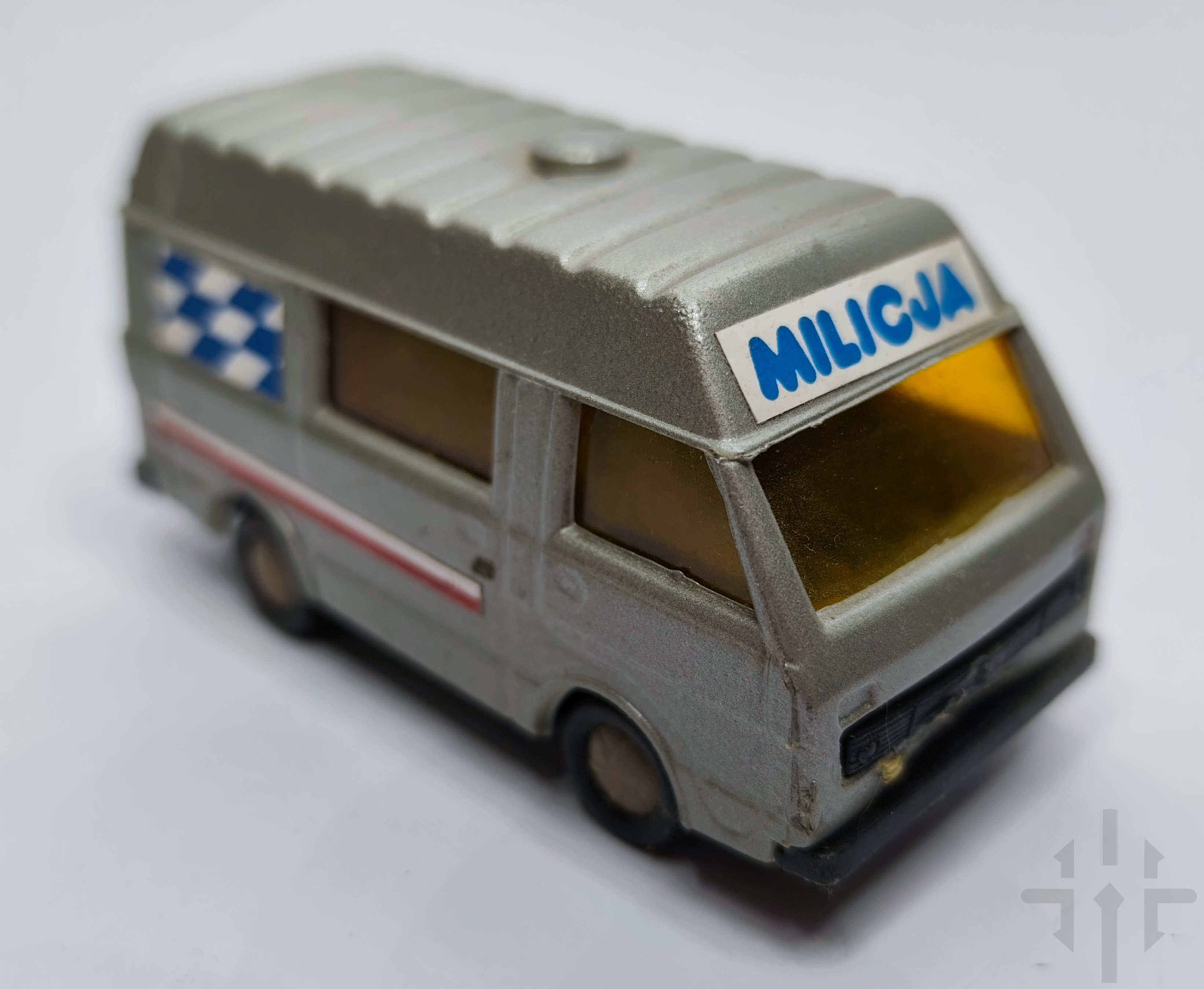 Model przedstawia szary furgon LT28 z niebieskim napisem „MILICJA”, niebiesko‑białą szachownicą na bokach. Posiada przyciemniane, bursztynowe szyby oraz detale typowe dla die‑castów z lat 70–90.